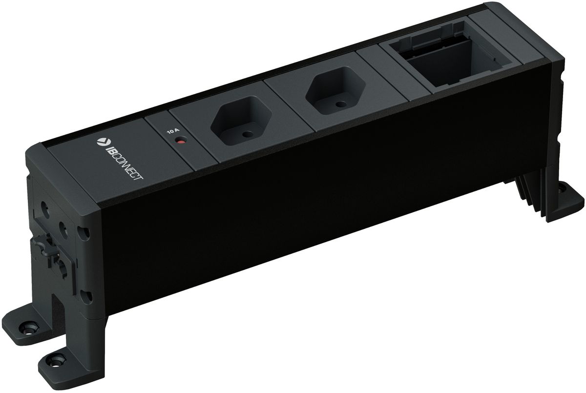 CUBO Steckdoseneinheit / Farbe: Profil schwarz RAL9017, Komponenten anthrazit RAL7016 / 2x Typ 13, 1x Leermodul / inkl. Befestigungsset erhöht / Material: Aluminium / Zuleitung: Steckverbinder mischverwendbar mit AC166 und dem Marktstandard in Endkappe / Montiert auf lackiertem Aluminium-Profil