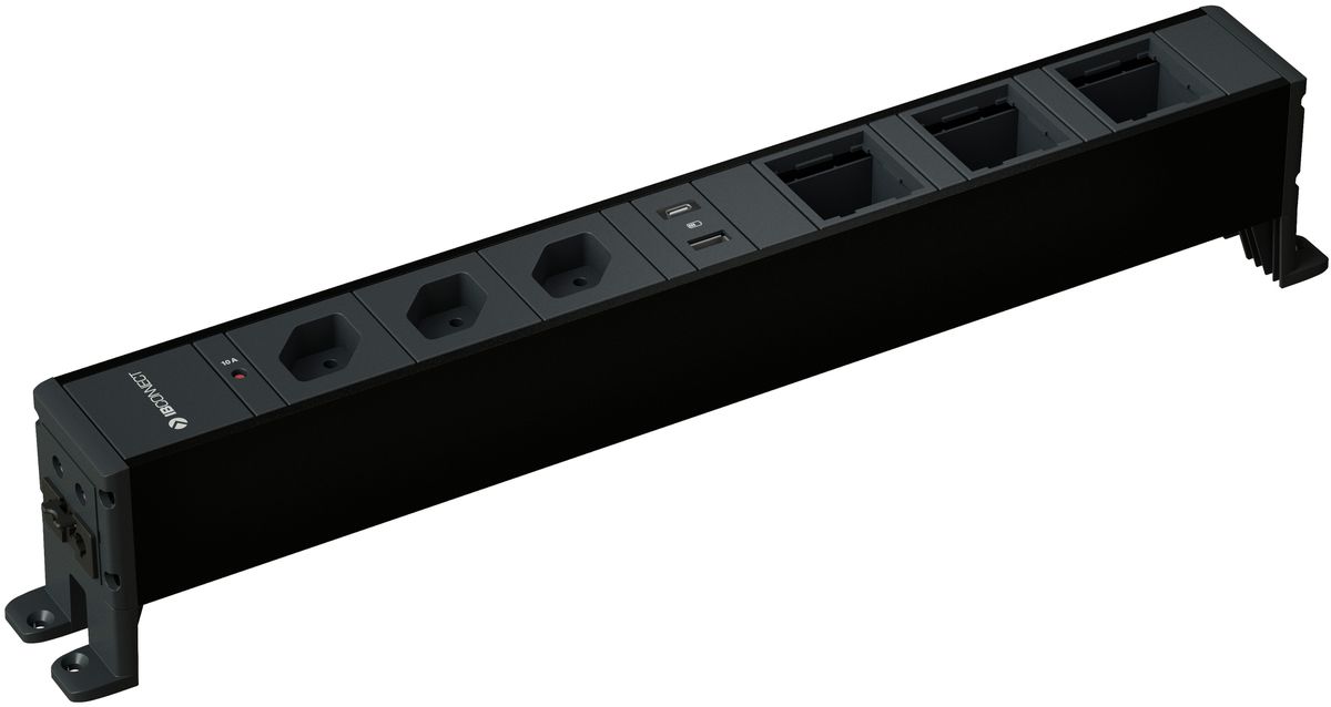 CUBO Steckdoseneinheit / Farbe: Profil schwarz RAL9017, Komponenten anthrazit RAL7016 / 3x Typ 13, 1x Charger USB-A 5/10W, 1x Charger USB-C 15W, 3x Leermodul / inkl. Befestigungsset erhöht / ALU / Zuleitung: Steckverbinder misch. mit Marktstandard in Endkappe / Montiert auf lackiertem Alu-Profil