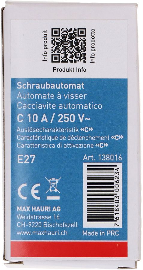 Dieser Schraubautomat bietet Ihnen einen zuverlässigen Schutz für Ihre Hausinstallation und ersetzt herkömmliche Schmelzsicherungen. Der Schraubautomat ist für den dauerhaften Einsatz konzipiert und damit für die Umrüstung von älteren Sicherungskästen geeignet. Nach einer erfolgten Auslösung wird er nicht ersetzt, sondern kann mit dem Resetknopf wieder eingeschaltet werden. Der Schraubautomat hat eine Auslösecharakteristik C und ist für einen Auslösestrom von 10A ausgelegt. Der Schraubautomat ist dank seines genormten E27 Gewindes einfach zu montieren und wird anstelle des bestehenden Sicherungskopfes in den Sicherheitssockels eingeschraubt.