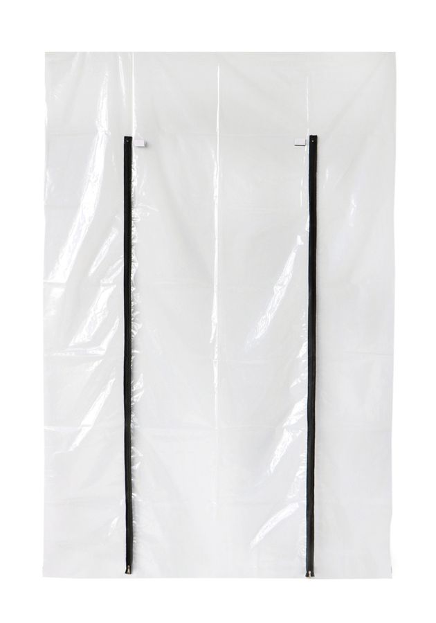 Porta trasparente con chiusura a cerniera in forma di H per separare in modo semplice e temporaneo aree di lavoro o di ristrutturazione. Dotata di due chiusure a cerniera verticali e nastri di fissaggio integrati per un'apertura comoda e una chiusura sicura dei pannelli di accesso. L'area di ingresso è di circa 0,75 × 1,80 m, la dimensione esterna è di 1,50 × 2,20 m. La struttura in pellicola trasparente garantisce inoltre una buona trasmissione della luce.