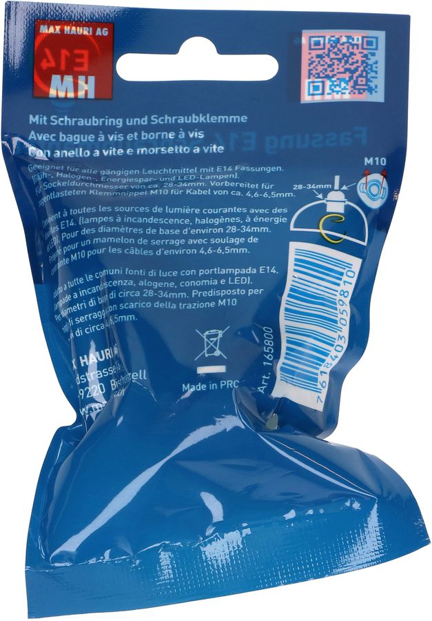 Il pratico portalampada è adatto al montaggio di tutte le comuni lampade con portalampada E14. Per diametri della base da 28 a 34 mm. Predisposto per nipplo di bloccaggio con scarico di trazione M10. Per cavi con diametro compreso tra 4,6 e 6,5 mm.